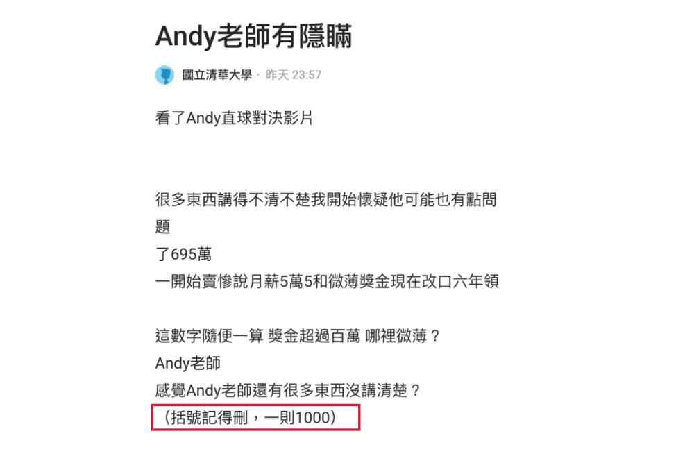 在事件發酵後,家寧母女於3月14日發出六點聲明試圖澄清,但內容卻被Andy火速打臉,並被網友發現其中多處疑點。不僅如此,網友在Dcard等社群平台上發現大量內容雷同的文章,標題均為「Andy老師有隱瞞?」,內文針對Andy的說詞進行質疑。然而,其中一篇文章的末尾卻似乎意外遺漏了「括號記得刪,一則1000」的字樣,讓網友懷疑家寧方可能雇用網軍攻擊Andy。此事引發熱議,不少人質疑家寧是否透過網軍輿論操作,試圖挽回聲勢。