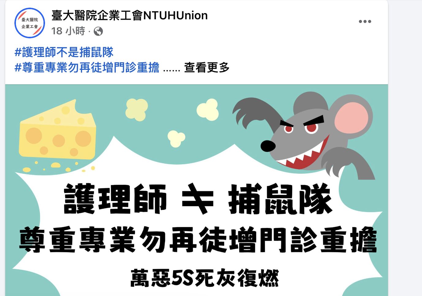 台大醫院企業工會是發文不滿,院方護理部4月18日下達指令「請各單位利用上班時間(例如開診之前08:30-09:00、用餐後13:00-13:30,或門診提早結束時段),執行工作區域環境整理與清潔」,甚至將於本月底進行初步評核與交叉互評。全因為有老鼠出沒門診。