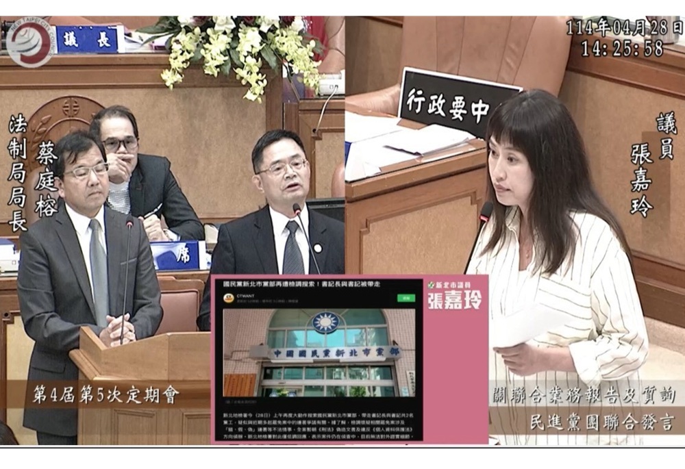 新北地檢署昨(28)日上午再度發動搜索行動,針對國民黨新北市黨部展開調查,並帶回書記、書記長兩名黨工,疑與近期多起罷免案中爆發的「死亡連署」、「偽造文書」爭議有關。面對社會譁然,新北市議員張嘉玲於議會向同為新北市選舉委員會總幹事的民政局局長林耀長提出質詢,要求新北市政府及新北市選委會嚴正面對。