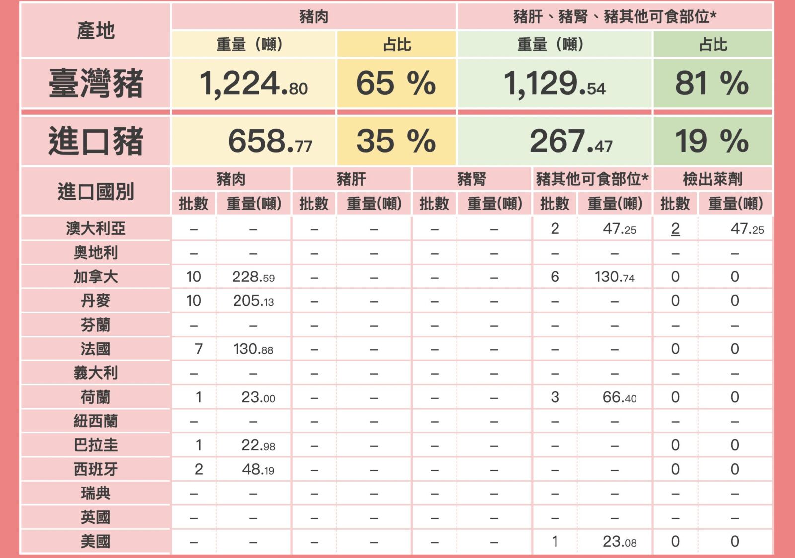 根據「豬肉儀表板」上午最新公布資訊,新增二批澳洲進口豬肉檢出萊劑,均為豬其他可食部位,檢出數值分別為0.002 ppm、0.003 ppm,數量則分別達23.71公噸及23.54公噸。