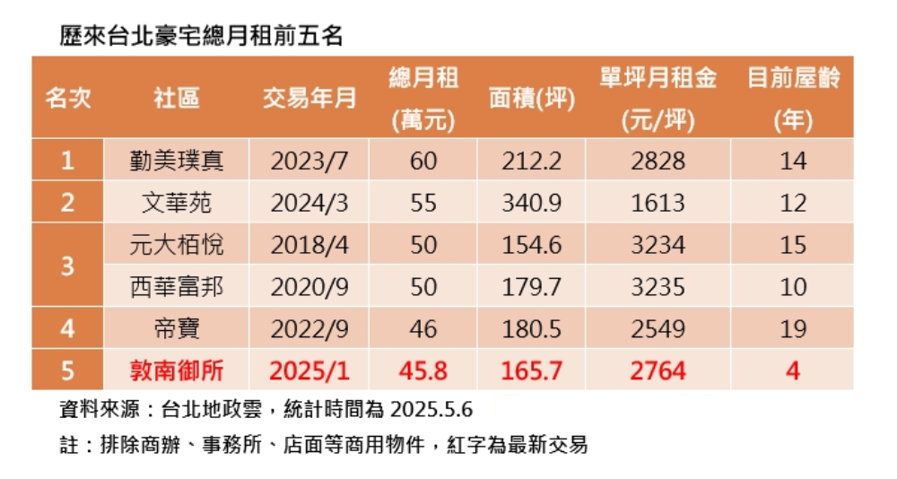 台灣房屋集團趨勢中心進一步統計實價登錄以來,台北市豪宅總月租前五名,冠軍是大安森林公園第一排豪宅勤美璞真,2023年時高樓層曾以總月租60萬元租出;第二高價是文華苑,2024年時有租客以每月55萬元承租高樓層戶,第三名則是元大栢悅以及西華富邦,月租50萬元。