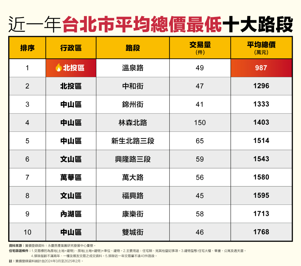 在寸土寸金的台北市,想要擁有一個屬於自己的家,對許多人而言是個不小的挑戰。但即使在高房價壓力之下,台北市仍有幾處房價相對親民的路段。永慶房產集團統計台北市近一年總價最低的十大親民路段,許多路段房價不僅親民,生活機能也相當齊全。其中北投區的溫泉路及中和街,分別以987萬元和1296萬元的平均總價,分別位居一二。