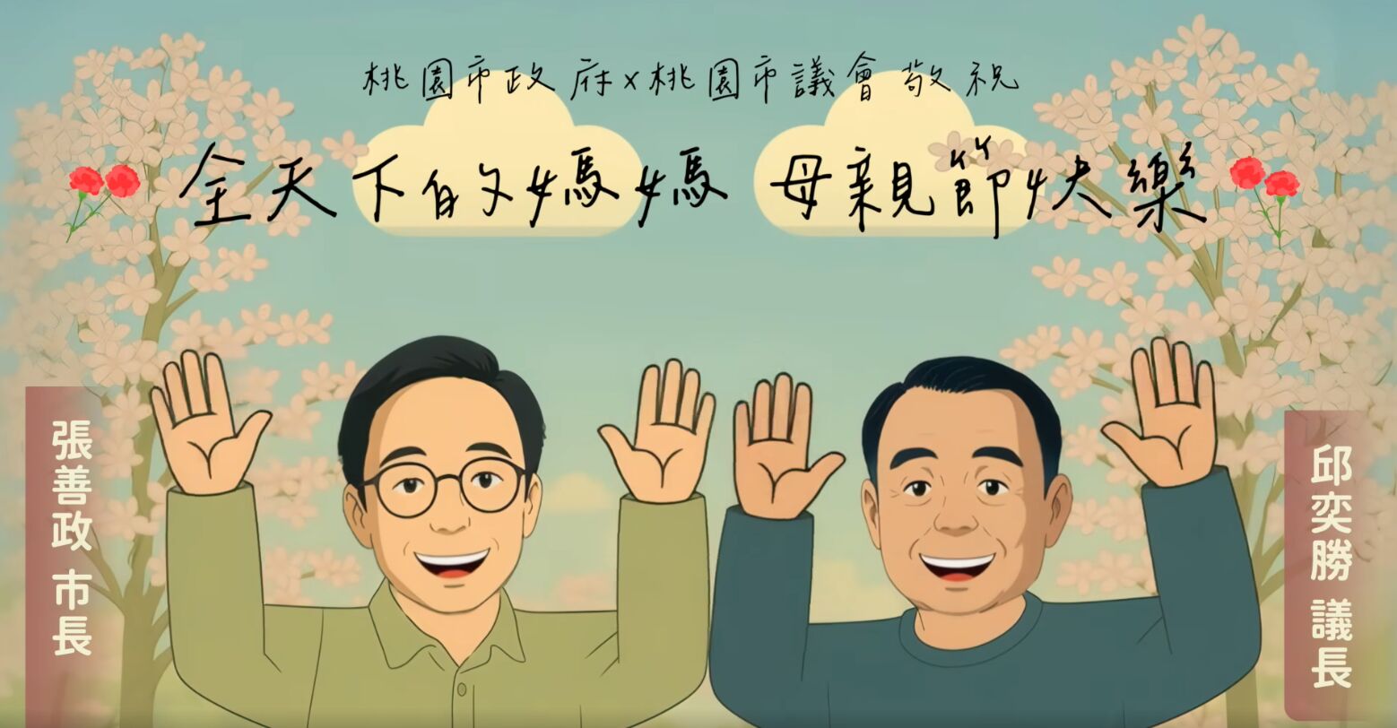 母親節將至,桃園市政府年輕同仁發揮創意,利用AI製作溫馨母親節影片,由桃園市長張善政、議長邱奕勝及議員們,帶領民眾暢遊桃園各區景點,並歡迎市民好友母親節到桃園一遊。桃園市長張善政今(10)日說,AI把每位議員神韻抓得維妙維肖,還讓他和每位議員「另類合體」,一起為所有媽媽們送上最真摯的祝福。