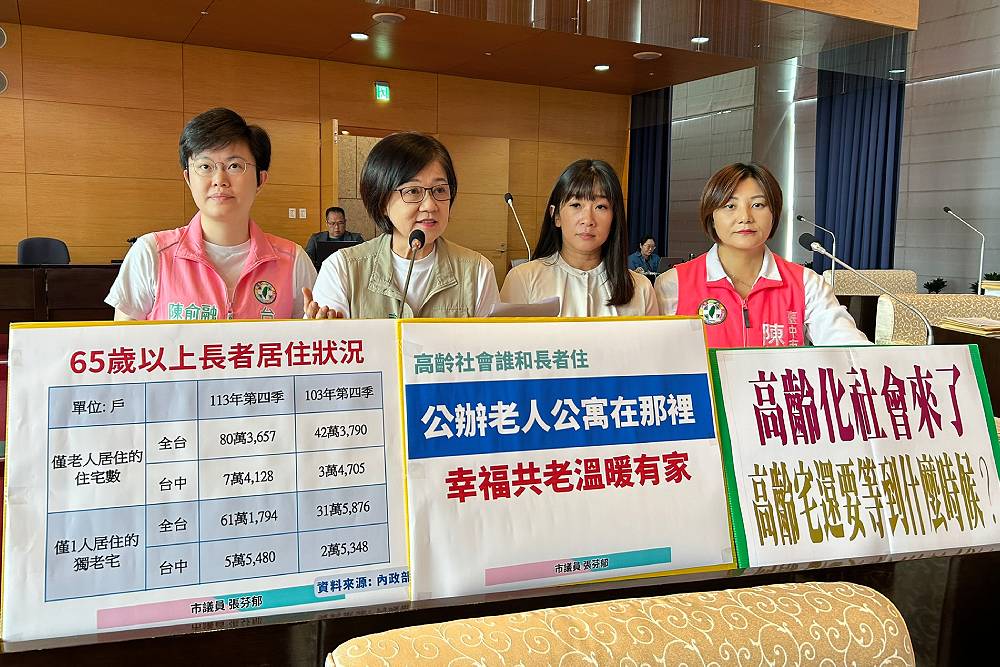張芬郁指出,內政部統計113年第4季,全國僅65歲以上長者居住的住宅數高達80萬3657戶,台中有7萬4128戶;其中僅一名老人居住的住宅數,全台有61萬1794戶,台中則有5萬5480戶。她表示,和10年前數據相比,全台僅65歲以上長者居住的住宅數有42萬3790戶,台中3萬4705戶,只有長者居住的住宅數攀升一倍。