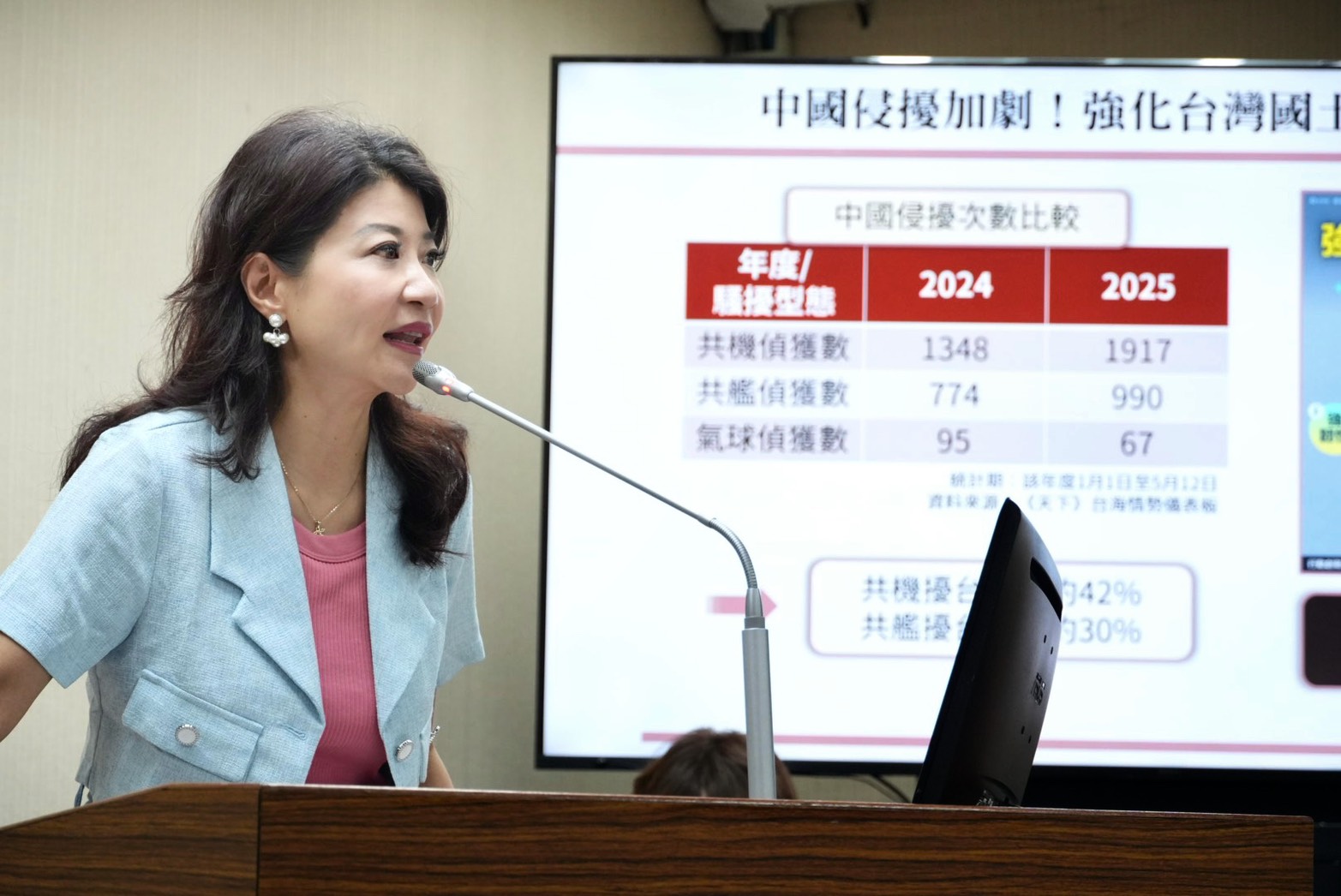 林楚茵指出,截至5月12日,中共軍機擾台達1917架次、共艦990艦次,較去年同期暴增42%與30%,顯示中國對台壓迫持續升溫,然而國防預算卻遭凍結,令人憂心國防部署是否及時到位。她呼籲國防部必須有萬全準備,並在國會層面積極溝通。