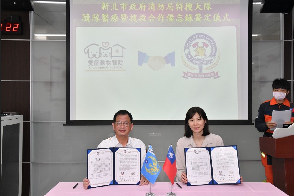 為提升搜救犬的健康照護與出勤效能,新北市政府消防局今(14)日與愛屋動物醫院簽署合作備忘錄,建立長期合作機制。新北市消防局長陳崇岳表示,由專業獸醫團隊協助搜救犬進行定期健檢、緊急醫療支援及健康管理諮詢,確保牠們在第一線執勤時能夠發揮最大效能。