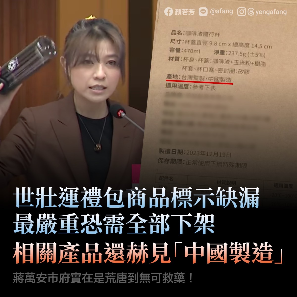 更令人震驚的是,顏若芳在國際電商平台發現,有人販售世壯運限定的咖啡渣隨行杯,外包裝赫然標示「台灣監製,中國製造」,與政府標案原則禁止使用中國製商品的立場明顯相悖。她認為,台北市府不僅未把關,還無意間助長中國商品進入台灣公共項目,嚴重背離政府政策。