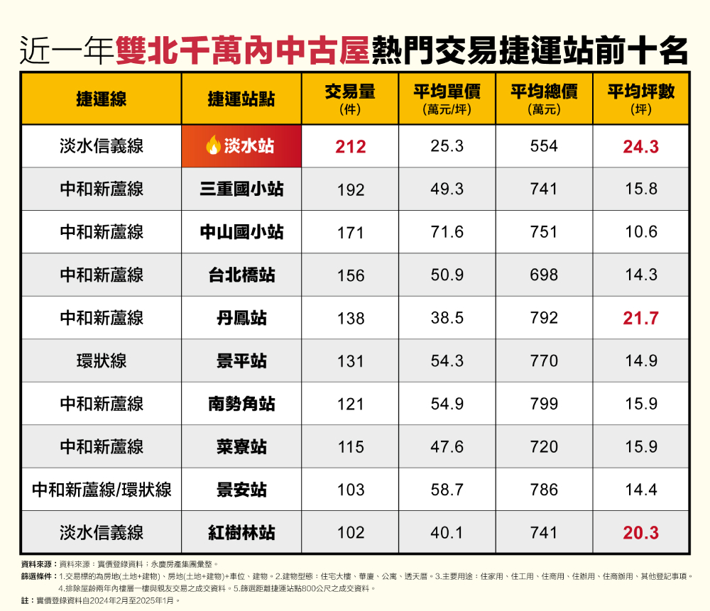 捷運作為雙北地區民眾通勤的重要交通工具,沿著捷運來找房也成為民眾購屋的決策方式之一。雖然捷運優勢往往帶動周遭房價居高不下,不過消費者仍然有機會找到交通便利、機能完善的千萬捷運宅。永慶房產集團根據實價登錄資料,盤點近一年雙北市總價千萬內中古屋熱門交易捷運站,以淡水站千萬內住宅交易量最多;在住宅空間部分,淡水站、丹鳳站和紅樹林站在千萬元預算內能買到20坪以上,坪數最高。