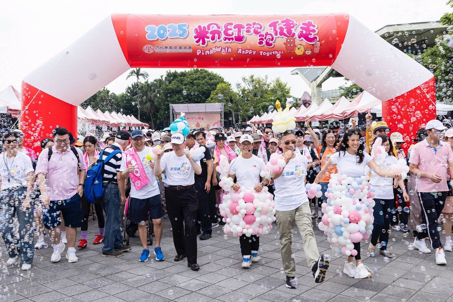 「2025粉紅泡泡健走」 今(17)日於圓山花博花海廣場熱鬧登場,響應同時開跑的世界壯年運動會,基金會邀請三位國家級運動代表,包含快艇衝浪隊長陳美彤、滑輪溜冰金牌楊合貞,以及國策顧問暨總統府健康台灣推動委員會委員簡文仁,身著象徵「乳癌防治防護罩」的泡泡裝,帶領現場超過3000名民眾大跳迷因神曲《露比醬~嗨》,向全台女性強力喊話:「預防乳癌,定期篩檢!」,鼓勵適齡女性參與這段壯年人生中不可缺的一場健康賽事。