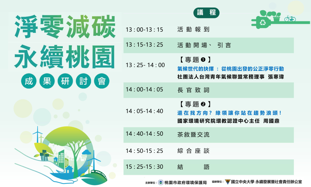 為提升市民對淨零(永續生活與淨零排放)概念的認識,桃園市政府環保局與國立中央大學5月26日將在中央大學羅家倫講堂共同舉辦「淨零減碳 永續桃園」成果研討會。活動將聚焦於淨零生活的推動與綠領人才的就業趨勢,同時邀請關心環境議題的市民與各級學校師生踴躍參與。