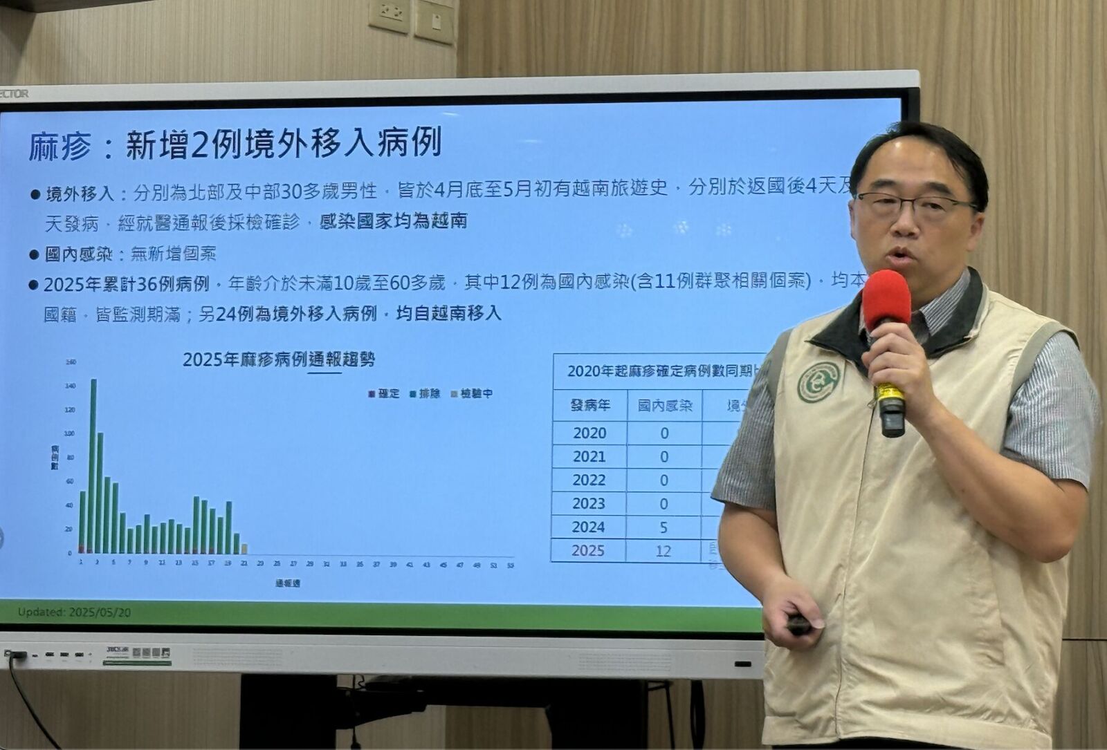疾管署疫情中心主任郭宏偉表示,今年截至5月19日,國內已累計36例麻疹病例,年齡介於未滿10歲至60多歲,其中12例為國內感染病例,另24例為境外移入病例,均自越南移入;今年國內感染及境外移入病例數為近6年同期最高。