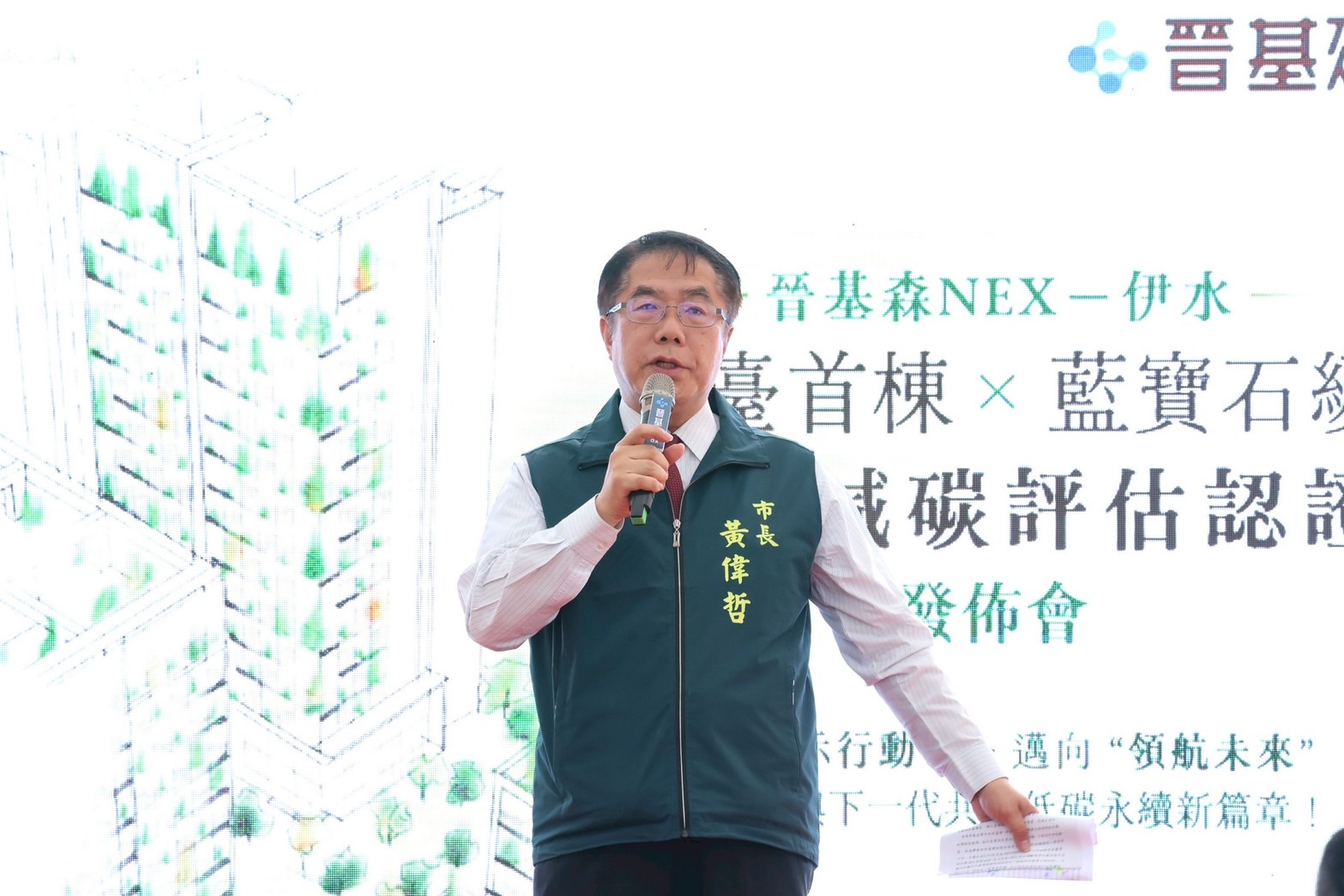 黃偉哲表示,淨零排放是台灣與全球共同追求的目標,唯有政府、產業與民眾攜手合作,才能實現;此次獲得藍寶石級認證的建案,其減碳率達30%以上,是目前台灣唯一取得此項認證的工程實例,具高度指標意義。他也期盼未來有更多建案投入環境友善的技術與設計,推動建築產業朝低碳轉型發展。