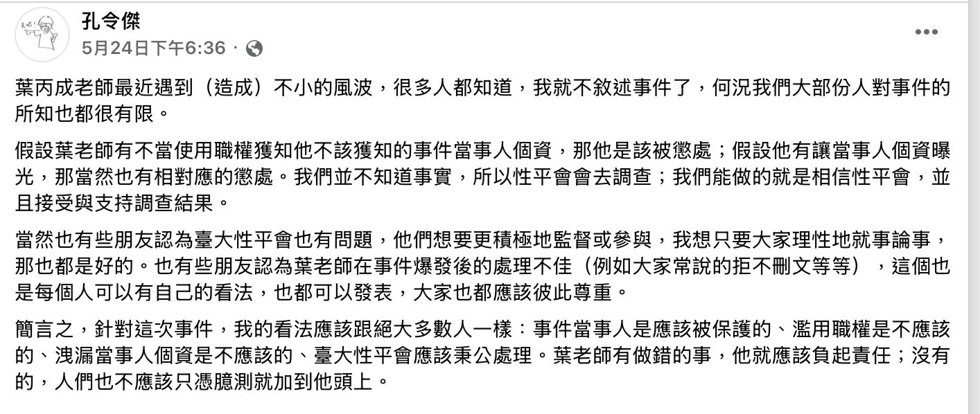 孔令傑重申,是否洩露性平案件當事人資訊大家並不知道事實,交由性平會調查,能做的就是相信性平會,並接受與支持調查結果。對這次事件,他支持事件當事人是應該被保護、濫用職權是不應該的、洩漏當事人個資是不應該的、臺大性平會應該秉公處理。葉老師如果有做錯的事,大家就譴責他、讓他負責;至於不知道好或不好的地方,希望大家至少可以聽聽各方意見。