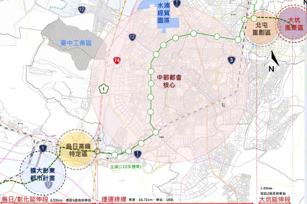 捷工局表示,綠線延伸段共3路段,大坑段長2.48公里,設2站,烏日段長3.14公里,設2站,彰化段長4.31公里,設4站,總共8站均為高架車站;大坑段跨越旱溪,預留延伸屯區環線,烏日段原經過榮泉路,改走中山路三段,彰化段原規畫3站,新增1站轉乘彰化輕軌。今日下午2點,將在彰化縣立圖書館辦理最後一場公聽會。