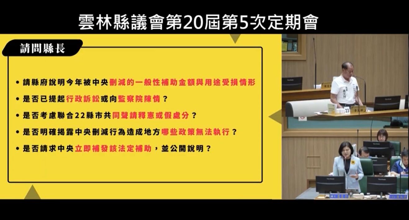 「中央用盡不同手段三殺減少地方政府財源,已造成地方基層及民眾困擾與困境。」張麗善指出,近期中央政府總預算遭立法院統刪,卻要地方政府埋單,雲林縣不只被刪減37.6億元一般性補助款,且中央統籌分配稅款從1月開始就有緩撥情形,至今已累計緩撥12億元。此外,中央各部會還大幅增加計畫型補助的地方自籌款比例,若加總下半年統籌分配款的緩撥、一般補助款刪減與提高地方自籌負擔,影響金額粗估超過50億元。