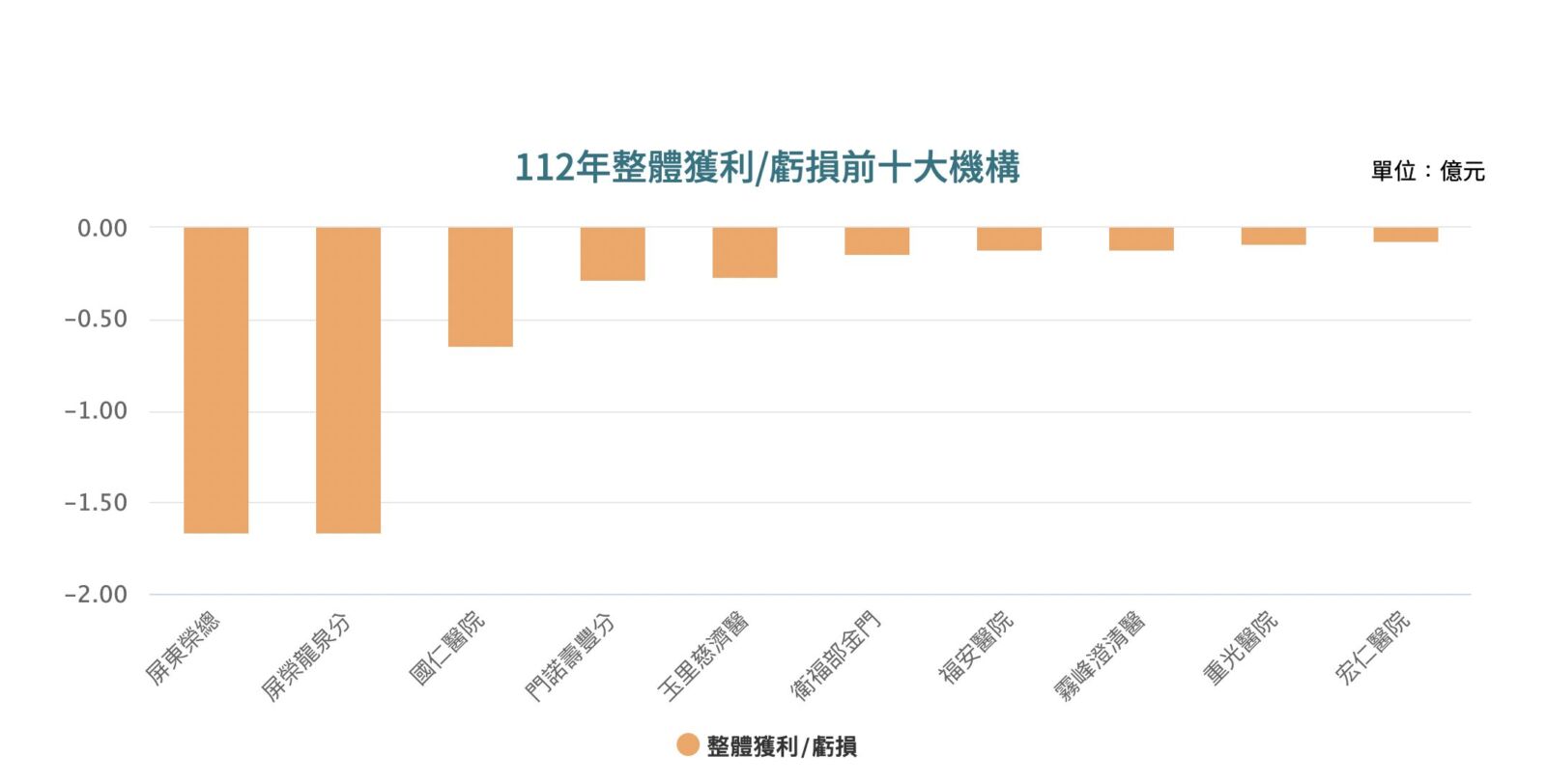 健保署同時也公布最賠錢的醫院,整體收支短絀金額前十大醫院依序為:屏東榮總含屏榮龍泉分院(-1.66億)、國仁醫院(-0.64億)、門諾壽豐分院(-0.28億)、玉里慈濟醫院(-0.27億)、衛福部金門醫院(-0.14億)、福安醫院(-0.12億)、霧峰澄清醫院(-0.12億)、重光醫院(-0.09億)、宏仁醫院(-0.07億)、龍潭敏盛醫院(-0.06億)。