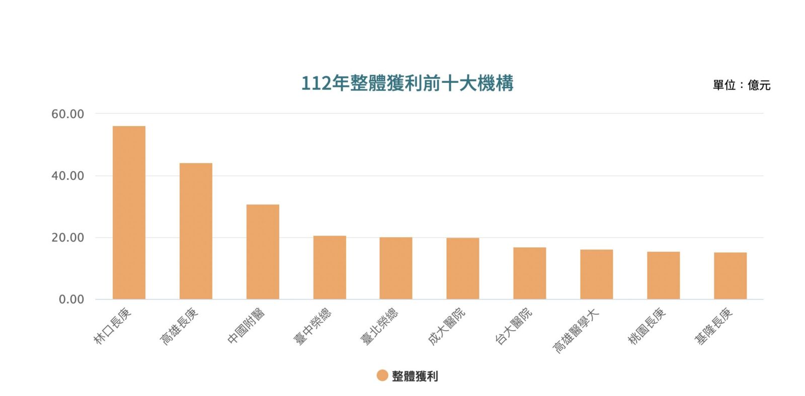 整體結餘排名前十大醫院依序為:林口長庚(56.31億)、高雄長庚(44.26億)、中國附醫(30.84億)、台中榮總(20.60億)、台北榮總(20.30億)、成大醫院(19.91億)、台大醫院(16.94億)、高醫附醫(16.20億)、桃園長庚(15.43億)、基隆長庚(15.21億)。