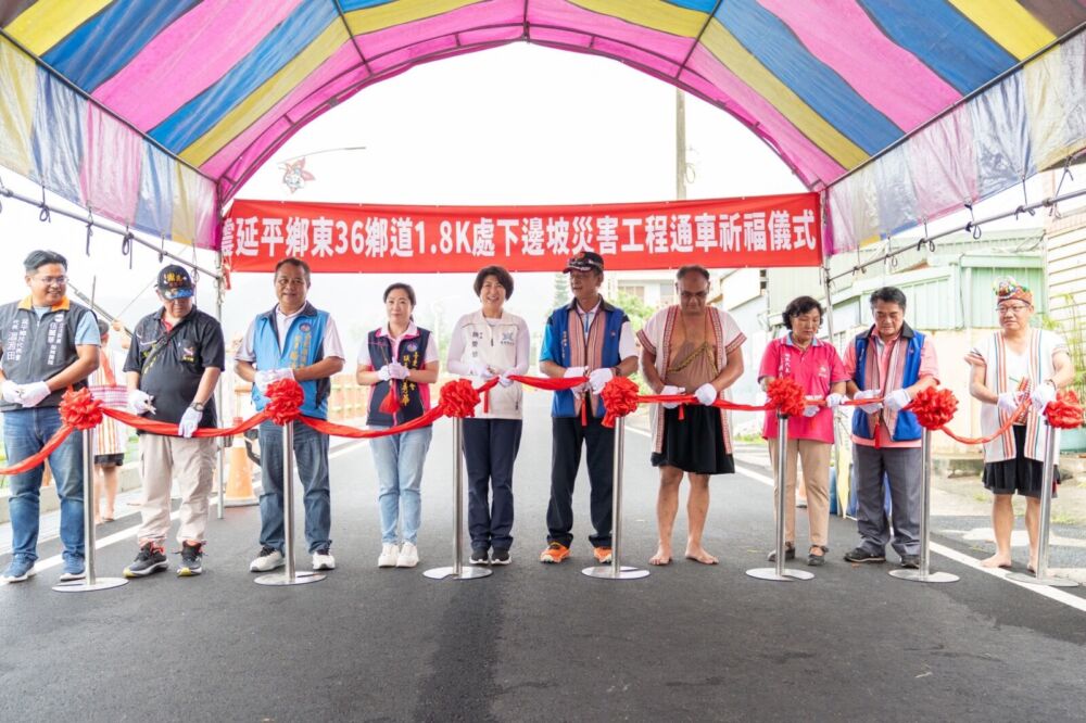 台東縣延平鄉對外聯絡重要交通幹道之一的「東36鄉道1.8K處下邊坡災害工程」歷經近3年終於完工,並於今(4)日通車。台東縣政府於今日上午舉行通車祈福儀式,台東縣長饒慶鈴出席並表示,此路段在111年0918地震時受損嚴重,經縣府積極爭取經費並歷經施工,如今正式完工通車,恢復延平鄉對外聯絡的重要生命線,確保民眾交通順暢與生命財產安全。