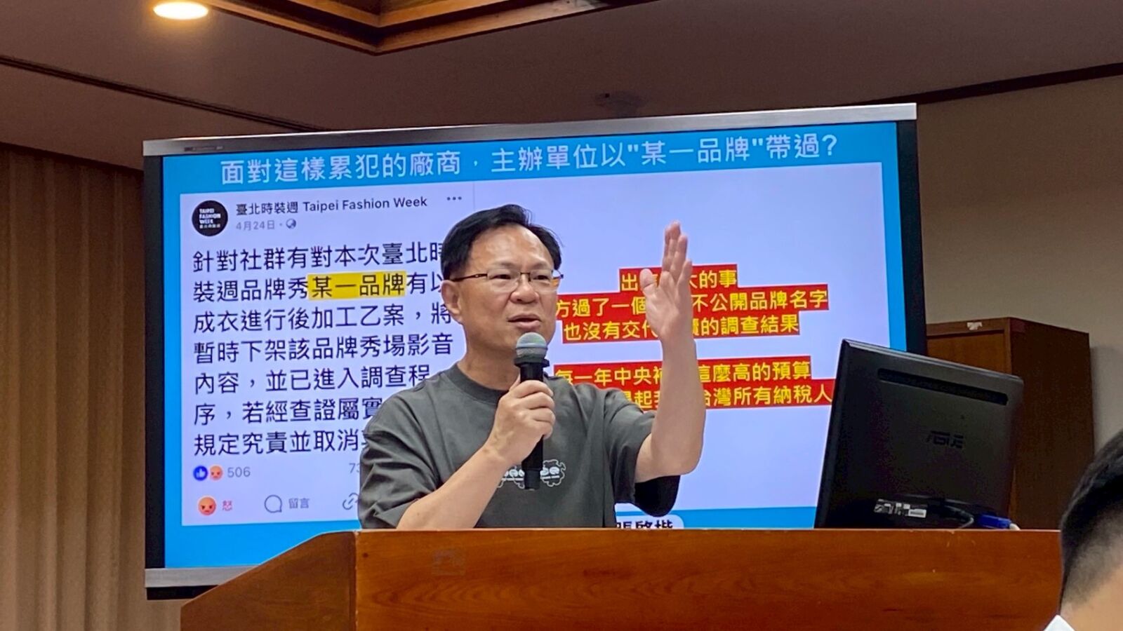 張啓楷強調,時裝週每年政府補助預算高達數千萬元,單一品牌秀即動輒上百萬,新銳品牌還有20萬補助,卻未嚴格規範產品來源,形同讓中國製品以台灣名義混水摸魚,讓抗中保台淪為笑話。