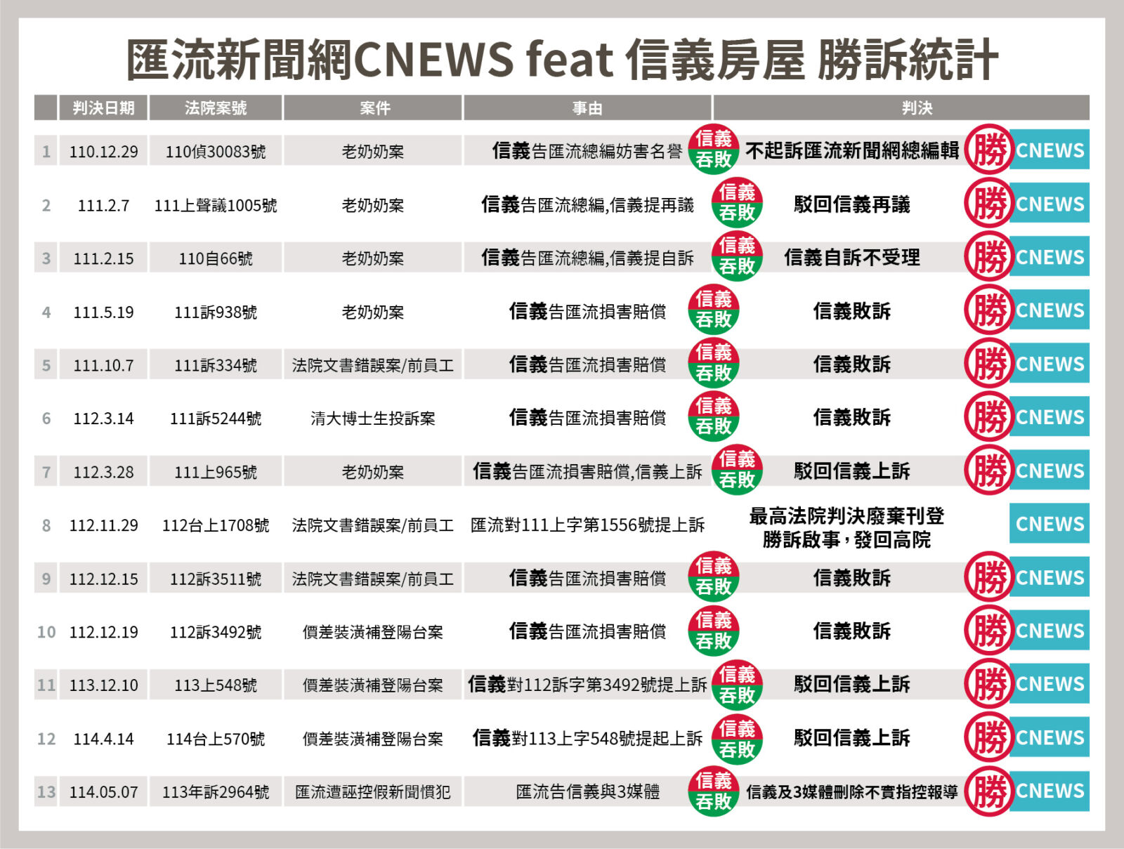 此外,自2021年以來,《CNEWS匯流新聞網》於與信義房屋間之多項訴訟案件中,包括110年度偵字第30083號(老奶奶篇)、111年度上聲議字第1005號(老奶奶篇)、110年度自字第66號(老奶奶篇)、111年度訴字第938號(老奶奶篇)、111年度上字第965號(老奶奶篇)、111年度訴字第334號(前員工篇)、112年度訴字第3511號(前員工篇)、111年度訴字第5244號(清大博士篇)、112年度訴字第3492號(陽台補登篇)、113年度上字第548號(陽台補登篇)、114年度台上字第570號(陽台補登篇)等,各級司法機關包含最高法院等,已累計11件獲判信義房屋全部敗訴案件,匯流新聞勝率超過九成以上,充分展現本網報導確實經得起法律檢驗與司法審查。