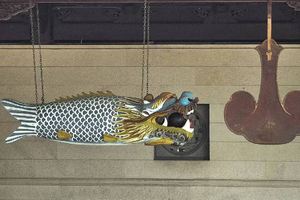 看到圖中的大魚了嗎?它被掛在廈門南普陀寺左邊的長樑上,雖然前面有個吉祥、富貴的大元實,卻不太受到遊客們的注意,因為,大家總以為寺廟建築裡只有鎮守大門的獅子、飛天騰雲的龍、穩重的大象、長壽的亀或是富貴的孔雀等等熟悉的動物。