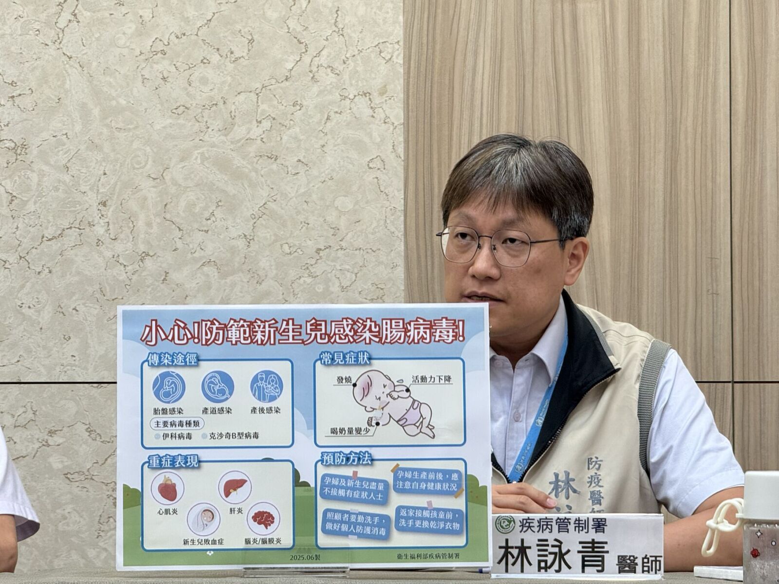 疾管署防疫醫師林詠青表示,上週新增2例腸病毒感染併發重症病例,為南部出生6天女嬰及出生3天早產兒男嬰,均於5月下旬發病,前者出現低體溫、肝功能異常、凝血功能下降等敗血症徵候;後者甚至直接因為呼吸困難、活動力下降、心跳過緩等情形,經診斷為腦膜炎,直接轉加護病房觀察。
