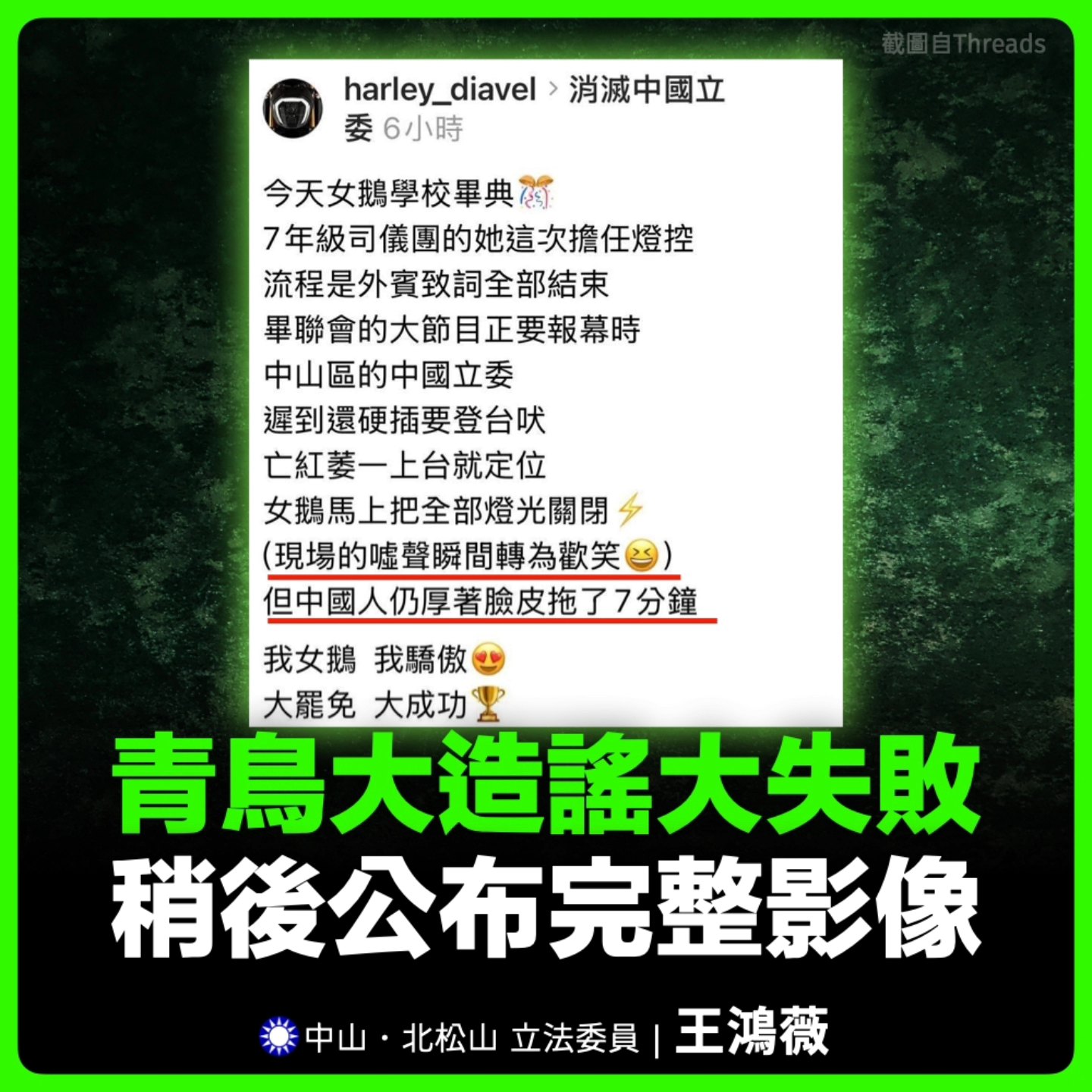 「Threads文描述狀況,完全不符合現實,手法低劣到令人難以置信。」王鴻微提到,事實上,大多數畢業典禮都會全程錄影,按照發文所描述的時間,應是指她選區的中山國中,且該帳號至少有2點造假。