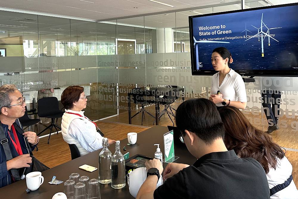 綠色國度為丹麥政府與產業界合作設立的全國性氣候行動推進及交流平台,主要在推廣丹麥的綠色技術和解決方案。王惠美指出,丹麥人口約600萬,2030年減量目標為溫室氣體排放較1990年減少70%,目前已減少48%,2050年目標為實現淨零排放,而且數據顯示丹麥的經濟成長與碳排放、能源與水量消耗呈現脫鉤趨勢,提供考察團員更宏觀的視角瞭解丹麥因應氣候變遷在綠色轉型的努力。