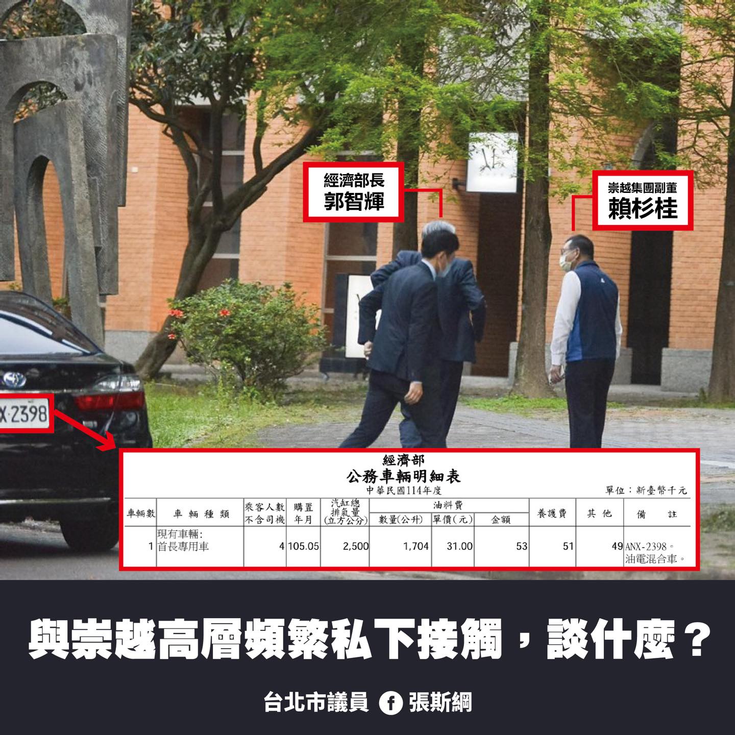 張斯綱於臉書貼出照片表示,4月17日傍晚,郭智輝被直擊與賴杉桂密會,地點正是自家公司旗下餐廳。他提到,這已非首次,過去也曾多次傳出郭智輝使用崇越自營場所宴客、以崇越產品作為官方贈禮,甚至與崇越高層頻繁私下接觸。