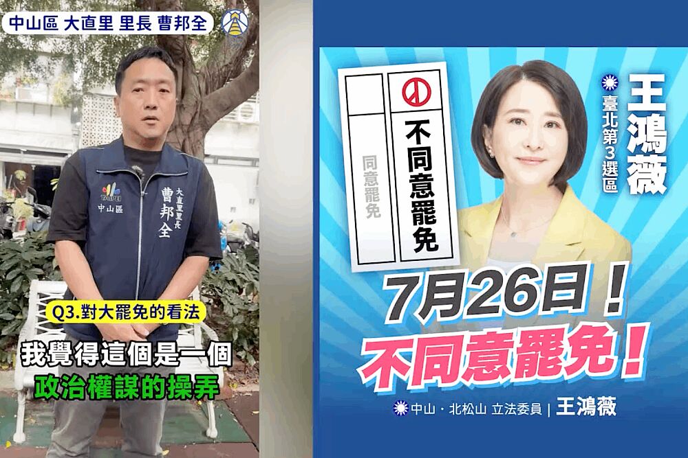 針對國民黨立法委員王鴻薇罷免案,台北市中山、松山兩區共有7位里長公開錄影力挺王鴻薇,表達反對罷免立場,呼籲民眾7月26日出門投下「不同意罷免」票。中山區有4位里長發聲,包括大直里、朱園里、永安里與埤頭里;松山區則有莊敬里、民福里與富錦里3位里長參與表態。