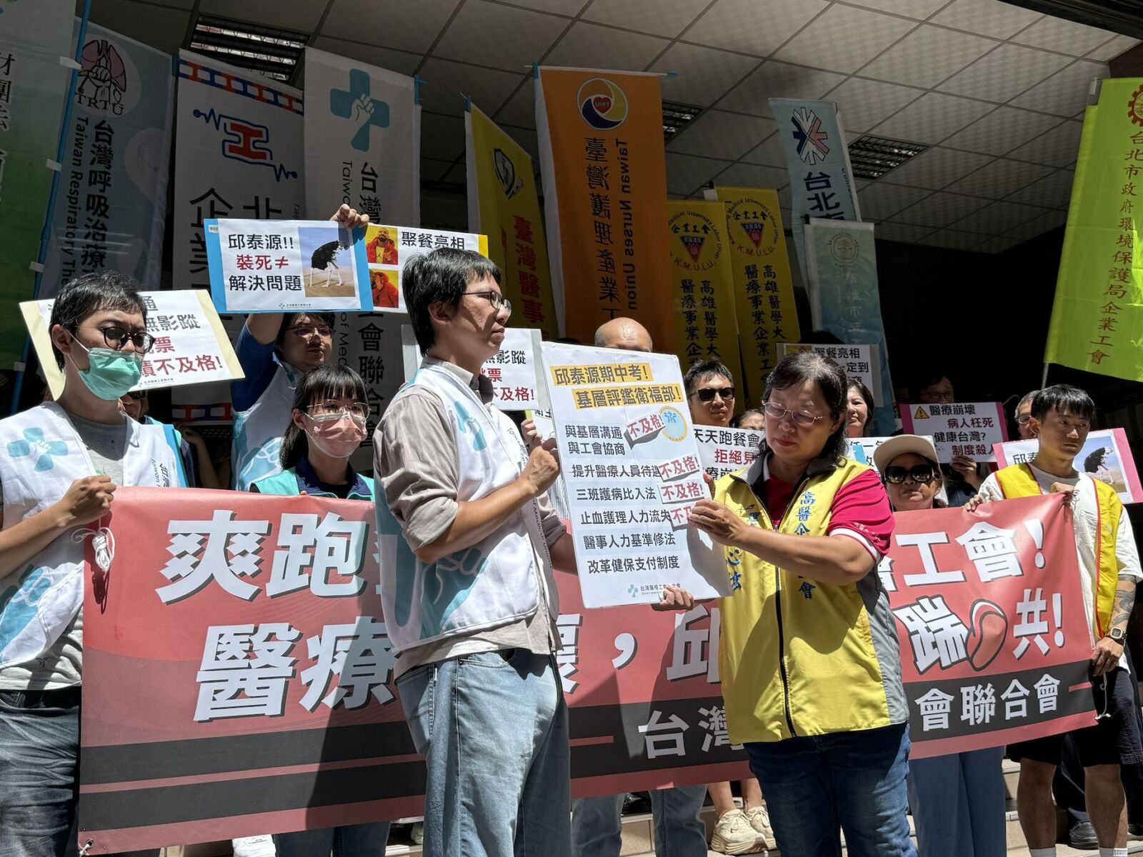 台灣醫療工會聯合會、高雄醫學大學醫療事業企業工會、嘉基體系戴德森醫療財團法人關係企業工會、台北市立聯合醫院企業工會、台灣護理產業工會、臺灣醫事檢驗產業工會等十多個醫療工會一行二、三十人上午赴疾管署前拉布條抗議,控訴邱泰源上任一年多、評鑑不及格。