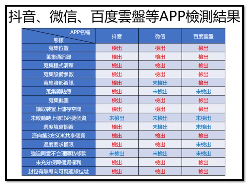 本次抽驗的中製APP,包含:「小紅書」、「微博」、「抖音」、「微信」及「百度雲盤」等5款國人熟悉的應用程式。法務部調查局及警政署刑事局採用數發部發佈「行動應用APP基本資安檢測基準v4.0」相關指標,針對「蒐集個資」、「逾越使用權限」、「數據回傳與分享」、「擷取系統資訊」及「掌握生物特徵」等5類違規樣態所涵括的15項評鑑指標,逐一進行驗測分析。