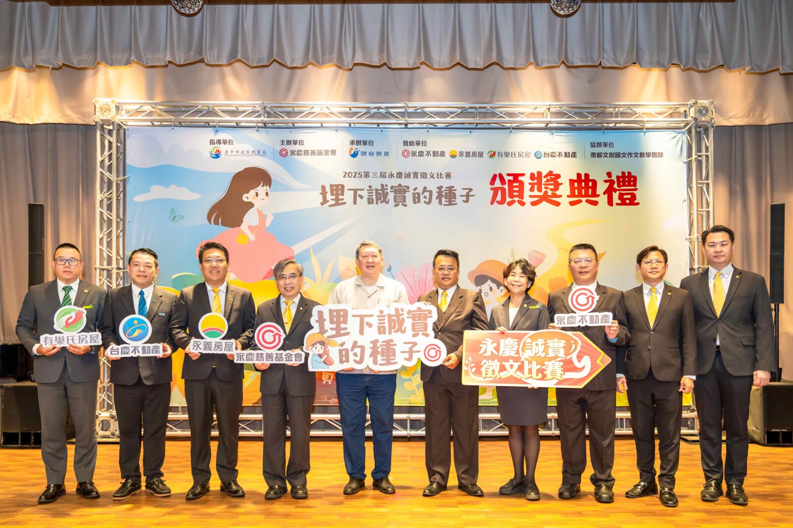 第三屆「埋下誠實的種子~永慶誠實徵文比賽」日前在逢甲大學盛大舉行大台中區賽的頒獎典禮,本次比賽由永慶慈善基金會主辦、台中市政府教育局指導,永慶加盟四品牌中區經管會持續擔任贊助單位,攜手校園推動品格教育,讓誠實理念深植下一代心中。