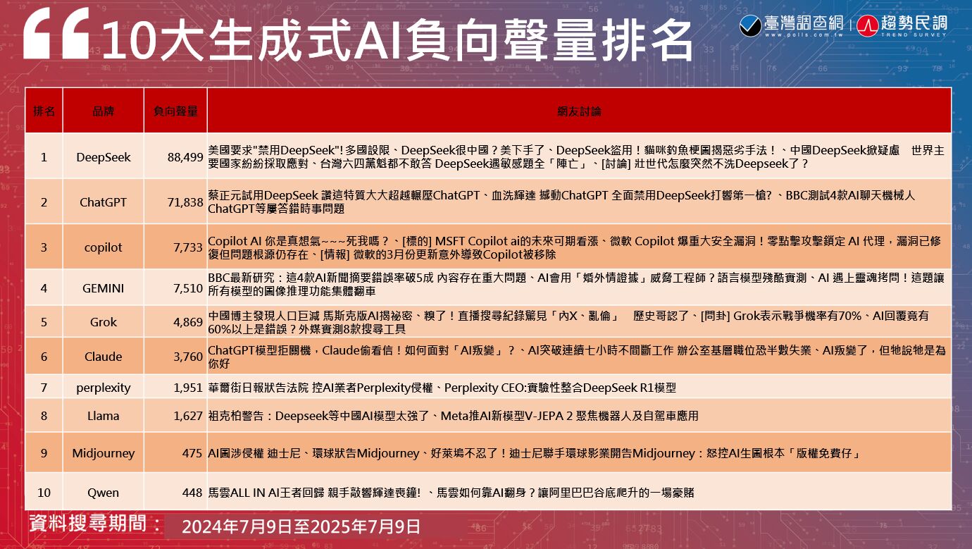ChatGPT雖未奪冠,仍以穩定的技術表現與多元應用保持第二大聲量。話題涵蓋「台中男刮中100萬歸功算命AI」、「主動限制侵犯宮崎駿版權內容」、「政府版ChatGPT Gov登場」等,展現其商業與公共領域的廣泛滲透。不過其71,838則負向聲量亦反映部分網友對其資訊準確度與政治立場存疑。